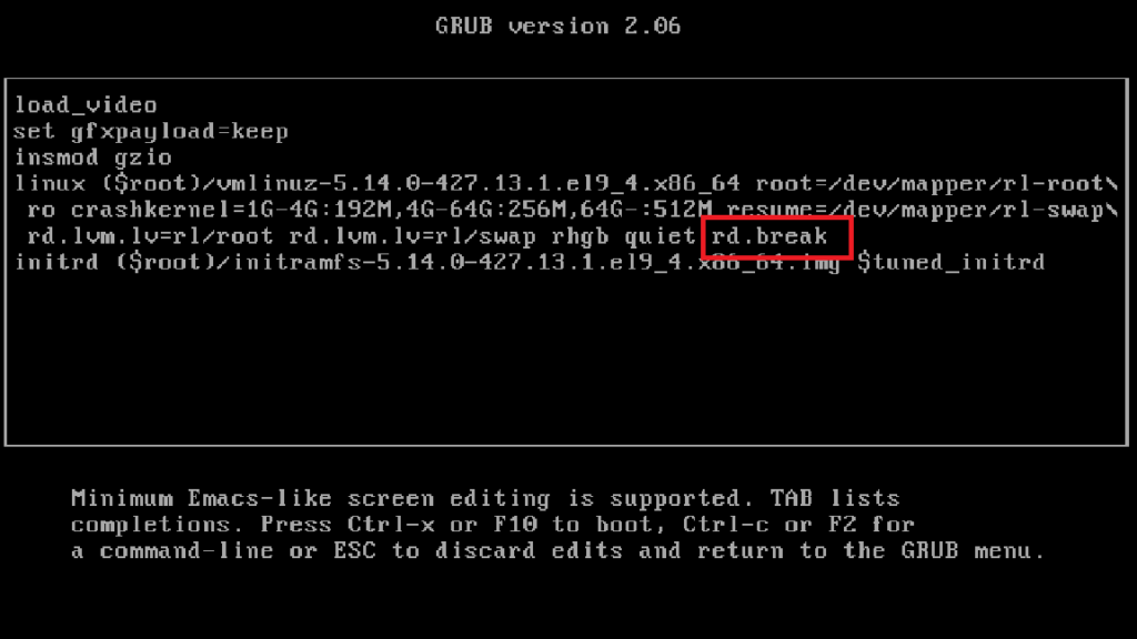 rd.break(for most Red Hat-based systems)- Alternatively, in RHEL 9, you may use
